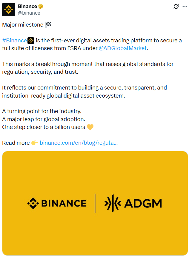 Криптовалютный гигант Binance получил три отдельные лицензии от финансового регулятора Абу-Даби, что позволяет ему официально предоставлять услуги для своей биржи, клирингового центра и брокеров в рамках регулятивной структуры Управления финансовых услуг (FSRA).