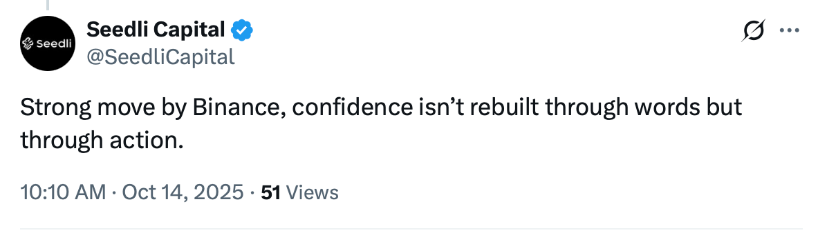 Вторничное заявление Binance вызвало смешанные реакции на X. В то время как некоторые пользователи, как SeedliCapital, похвалили биржу за восстановление "доверия" благодаря предпринятым действиям, другие не проявили столь великодушия.