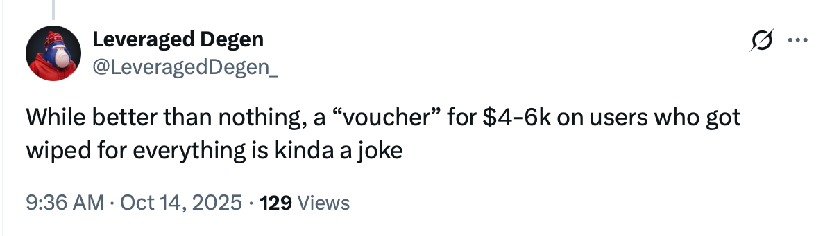 Другие отметили, что компенсации были приветствованы, но они не покрыли убытки выходных. “Хотя это лучше, чем ничего, 'ваучер' на сумму от $4 до $6 тысяч для пользователей, которые потеряли все, выглядит как шутка”, - написал LeveragedDegen.