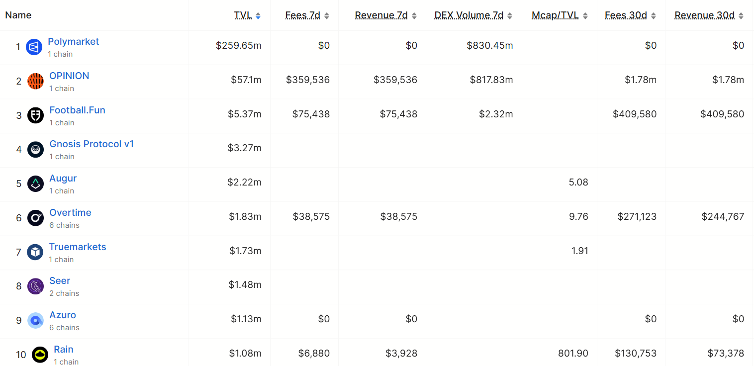 Rain является десятым по величине рынком предсказаний в блокчейн-индустрии, с общим заблокированным капиталом (TVL) $1 миллион и ежемесячной выручкой в $73,378 за последние 30 дней, по данным агрегатора блокчейн данных DefiLlama.