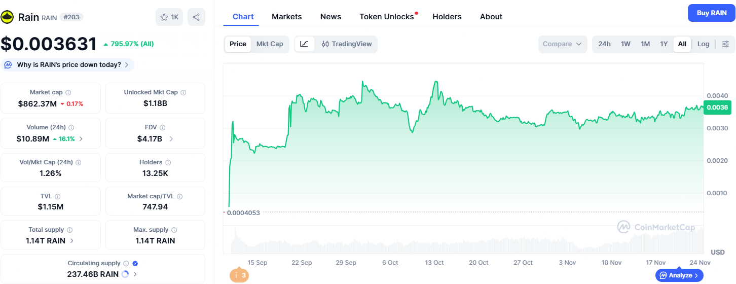 Запущенный 9 сентября, токен Rain занимает 203-е место по величине с капитализацией $862 миллиона. Его цена выросла более чем на 9% за последний месяц и примерно на 795% с момента запуска, согласно CoinMarketCap.