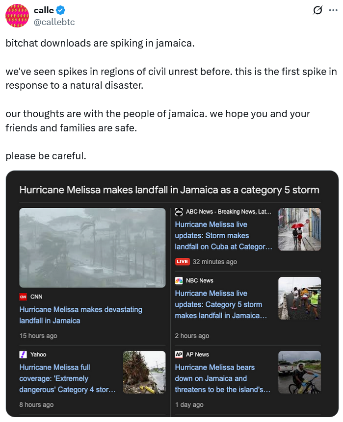 Жители Ямайки начали активно скачивать децентрализованное приложение для обмена сообщениями Bitchat, созданное Джеком Дорси, в то время как ураган Мелисса продолжает наносить разрушения в Карибском регионе.