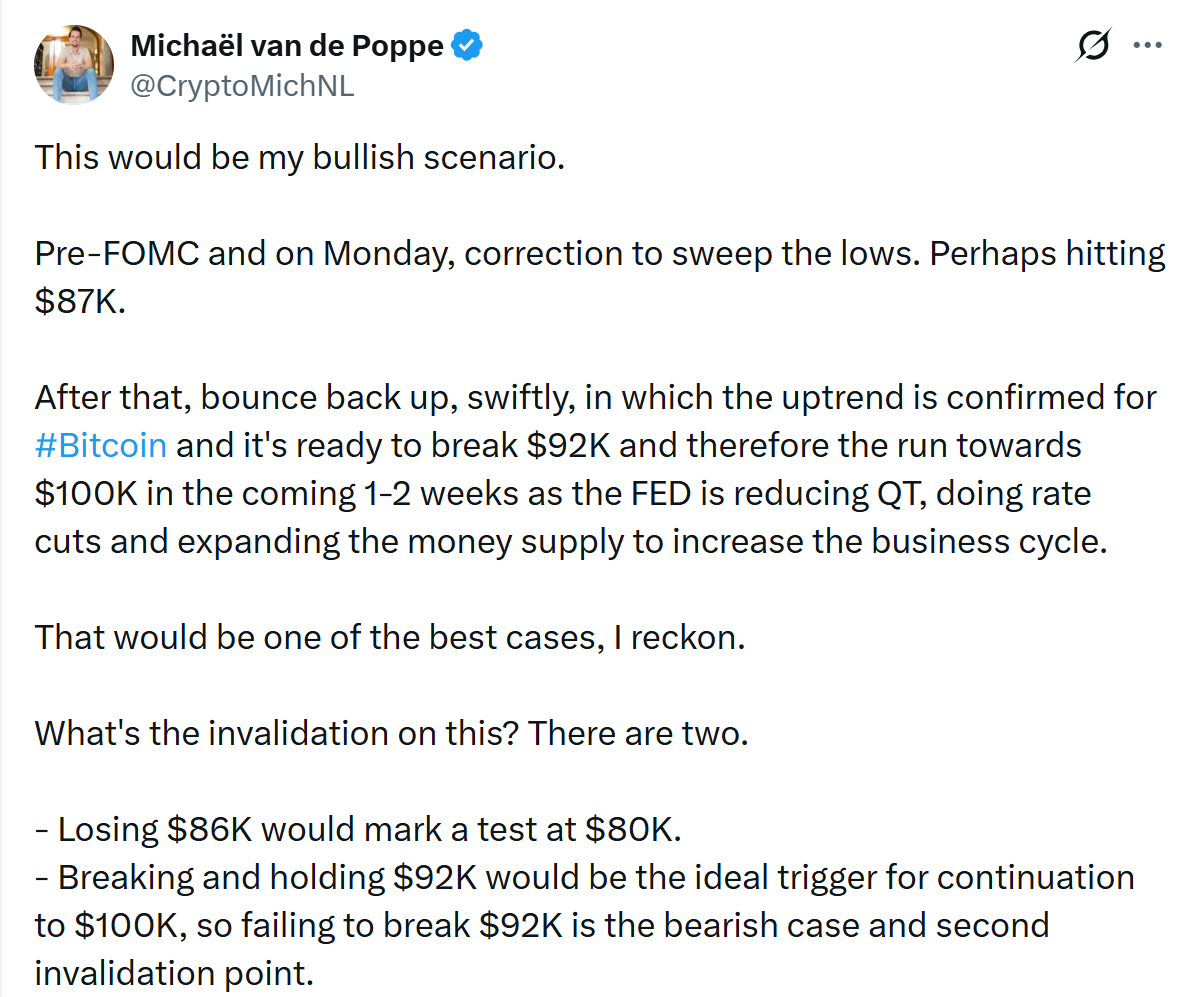 Ван де Поппе ожидает, что восходящий тренд возобновится, как только Биткоин протестирует поддержку и преодолеет ключевой уровень в $92 000, что, по его мнению, может открыть путь к достижению $100 000 за одну-две недели. Он связывает эту перспективу с благоприятной макроэкономической ситуацией, включая сокращение количественного ужесточения, предстоящие снижения ставок и расширение денежной массы.