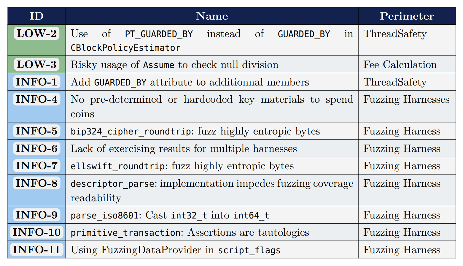 Команда не обнаружила уязвимостей высокой или средней степени опасности, выявив лишь две малозначительные проблемы и несколько предложений по улучшению, в основном касающихся формирования тестов и покрытия. Ни одно из найденных замечаний не оказало влияния на консенсус, устойчивость к отказу в обслуживании или проверку транзакций.