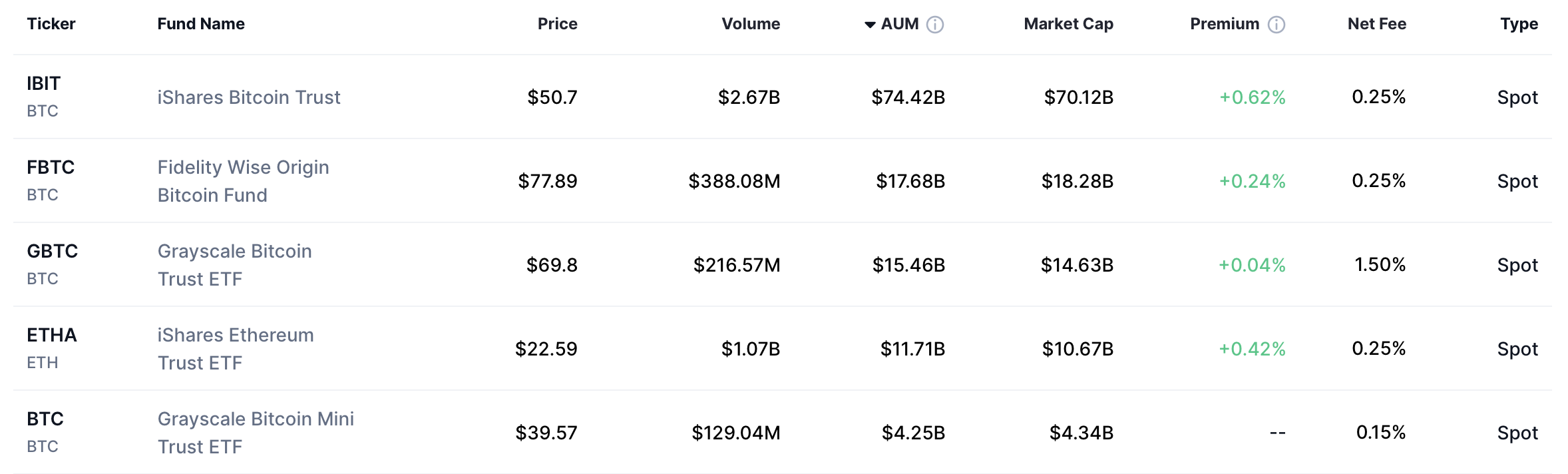 BlackRock, один из крупнейших управляющих активами в мире, запустил свой биткоин-ETF в январе 2024 года. По данным CoinMarketCap, капитализация фонда превышает 70 млрд долларов, что делает его крупнейшим спотовым фондом на биткоин.