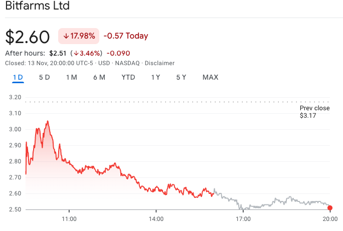 Акции Bitfarms (BITF) упали в четверг после публикации результатов, закрыв торговый день с почти 18%-ным падением до $2,60, с потерями, увеличивающимися на 3,5% до $2,51 в ходе торгов после закрытия.