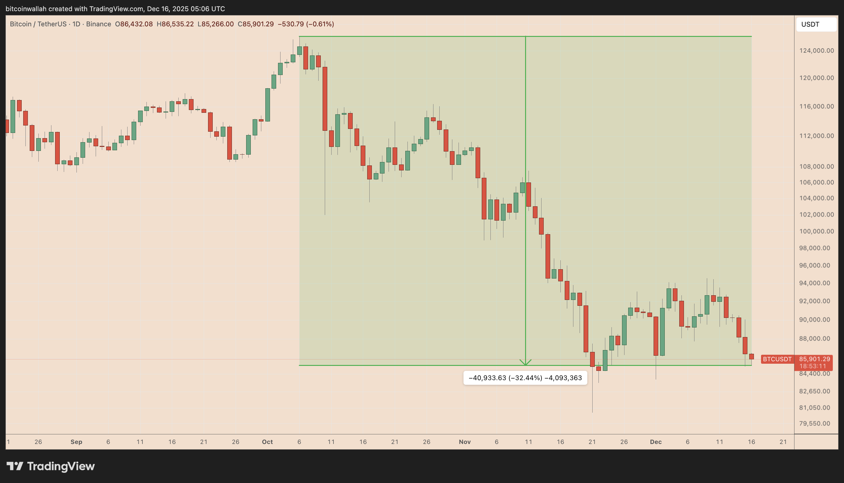 Биткойн (BTC) упал на 30% по сравнению с пиковыми показателями в $126,200, торгуясь немного выше уровня поддержки в $85,000, что вызывает опасения о более глубоком откате к региону $70,000. Тем не менее, данные цепочки показывают, что учреждения и состоятельные частные лица накапливают BTC.