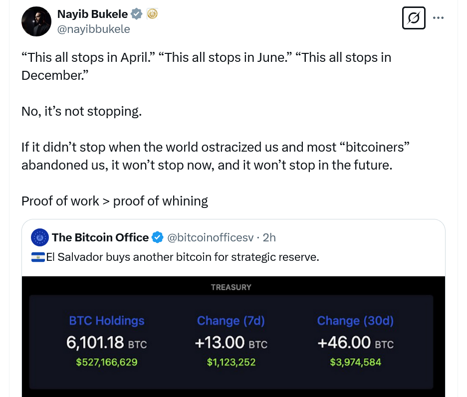 Однако Букеле придерживался своей позиции: в марте, несмотря на многочисленные просьбы МВФ прекратить покупки Биткойна, он продолжил совершать приобретения. Букеле написал об этом в X в то время:
