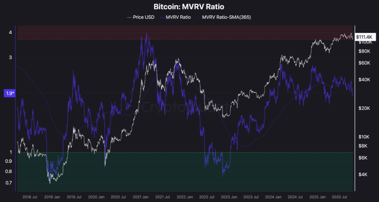 С 18% падением цены BTC до $103,530 в пятницу с исторического максимума в $126,000, коэффициент MVRV снизился, что отражает уменьшение спекулятивного избытка и рост долгосрочной уверенности, добавил аналитик: