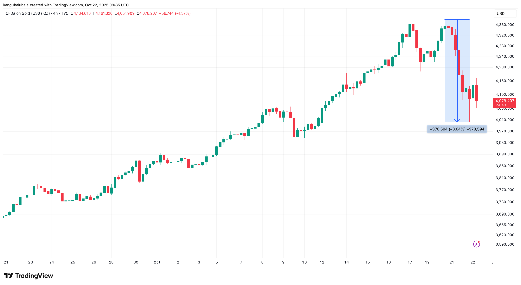 По данным, золото упало на 8,5% от своего исторического максимума в $4,380, достигнутого в понедельник.