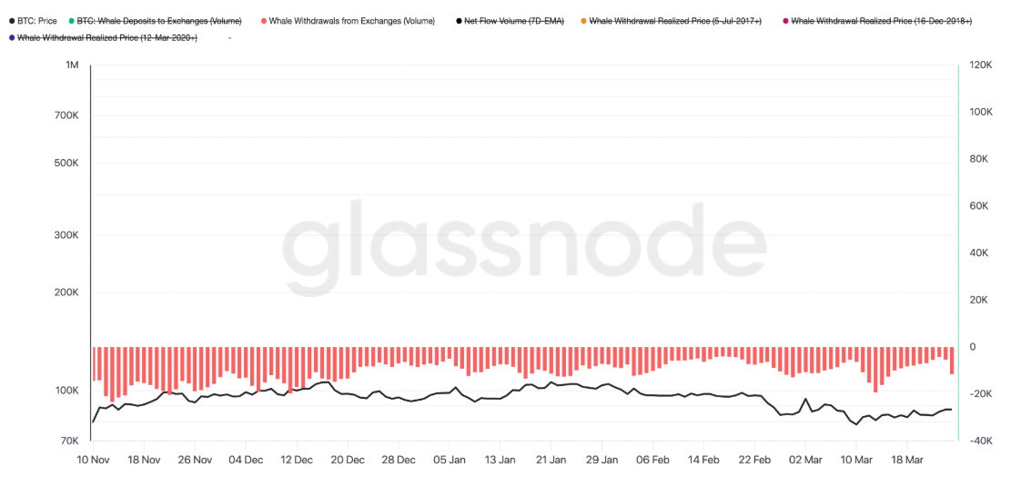 Анализ данных показывает, что значительную часть этих выводов совершили "киты" или лица, владеющие как минимум 1 000 BTC, которые вывели более 11 574 BTC на сумму примерно 1 миллиард долларов 25 марта.
