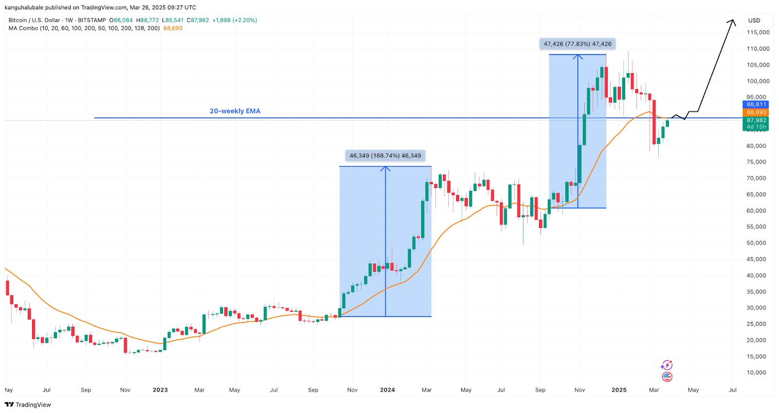 Аналогичная динамика имела место, когда цена превысила 20-недельную EMA в сентябре 2024 года, что предшествовало росту на 77% c $60,000 до $108,000 в декабре 2024 года.