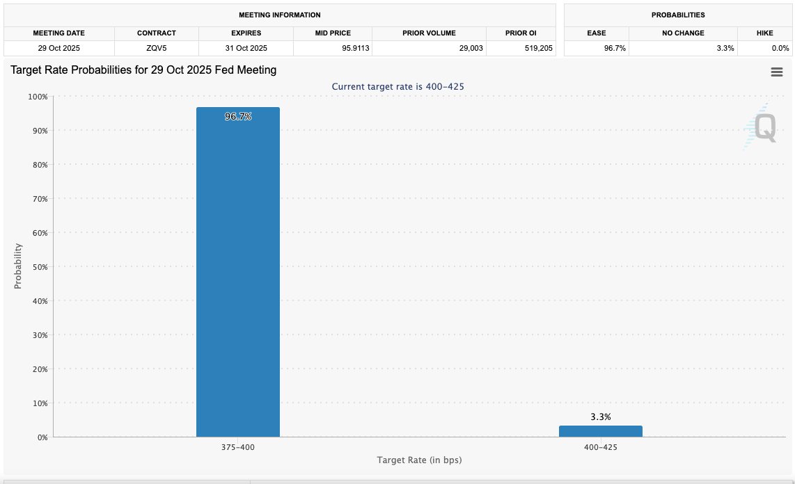 Инструмент FedWatch Tool от CME Group, который отслеживает рыночные ожидания по изменению процентных ставок ФРС, в основном указывает на уменьшение на 0.25% 29 октября.