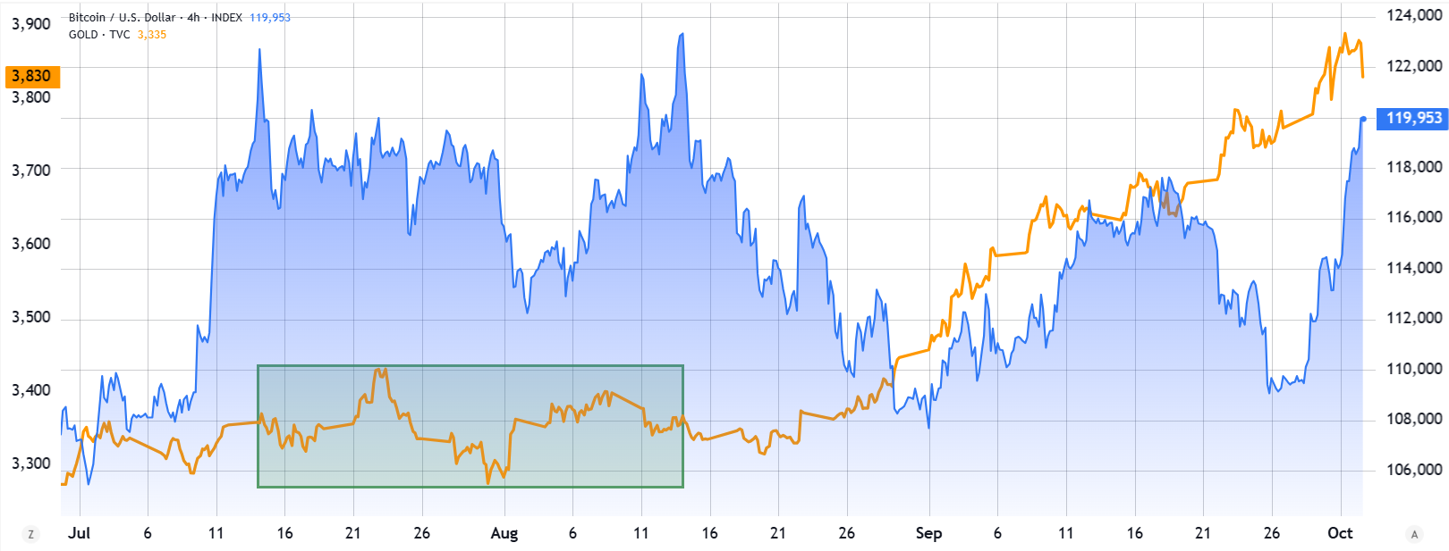 В то же время золото находилось на уровне около $3,400 почти два месяца до середины августа, когда биткоин достиг своего рекордного значения. Тогда мировая торговая напряженность усиливалась, так как временное снижение тарифов на импорт из Китая в США завершилось 12 августа, повышая ожидания инфляционного давления.