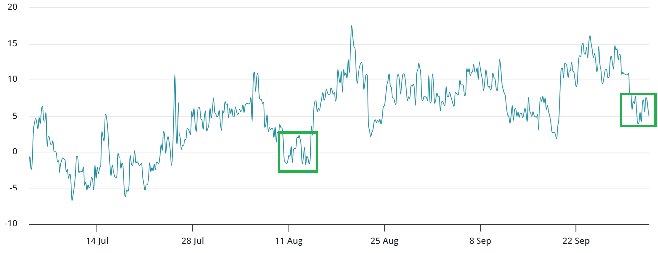 В течение трех дней до рекордного уровня биткоина в середине августа трейдеры оценивали приблизительно равные шансы на повышение и понижение цен, согласно данным производных. Сегодня, однако, этот индикатор опционов BTC сигнализирует о умеренной боязни коррекции, с продаже опционами (put) торгуемыми с премией по сравнению с опционами на покупку (call).