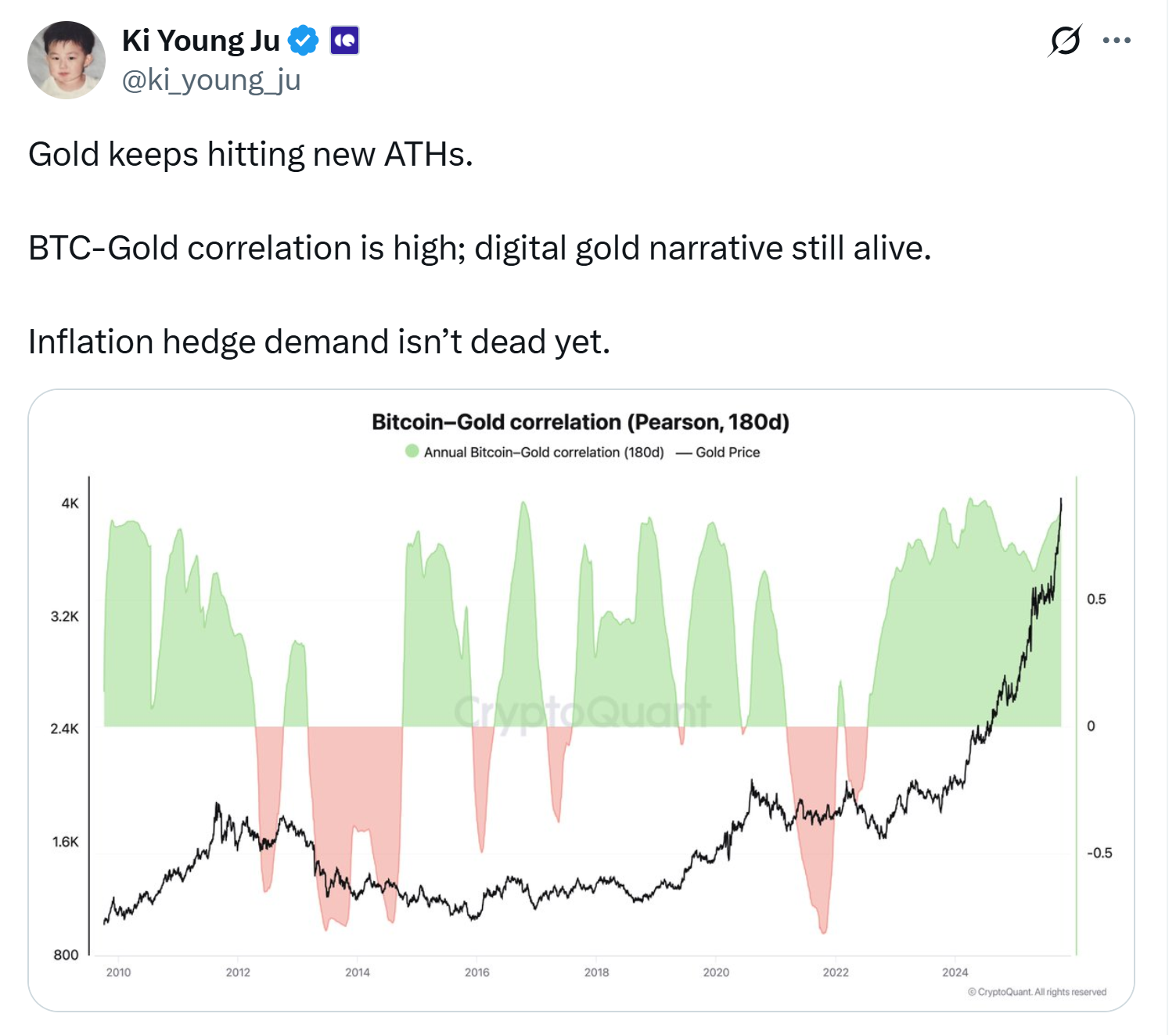 В своем сообщении во вторник на X Джу отметил, что корреляция между BTC и золотом резко возросла вместе с ростом цены золота до новых исторических максимумов. «Золото продолжает бить новые рекорды. Корреляция BTC и золота высока; идея цифрового золота все еще актуальна. Спрос на защиту от инфляции не исчезает,» — написал он.