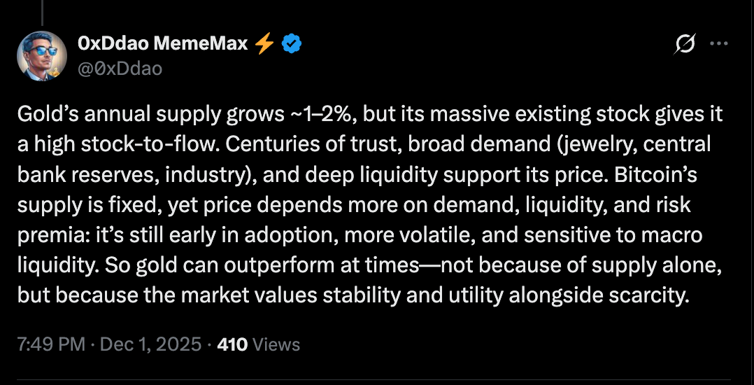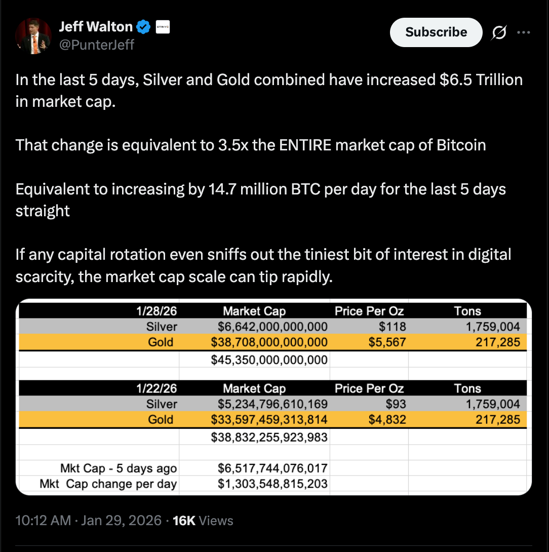 Теоретически, если 5% капитала из золота перетечет в Bitcoin, это будет означать приток свыше $2 трлн, что эквивалентно росту капитализации BTC примерно на 116,25% и дает ориентир цены около $192 000 при текущих оценках.