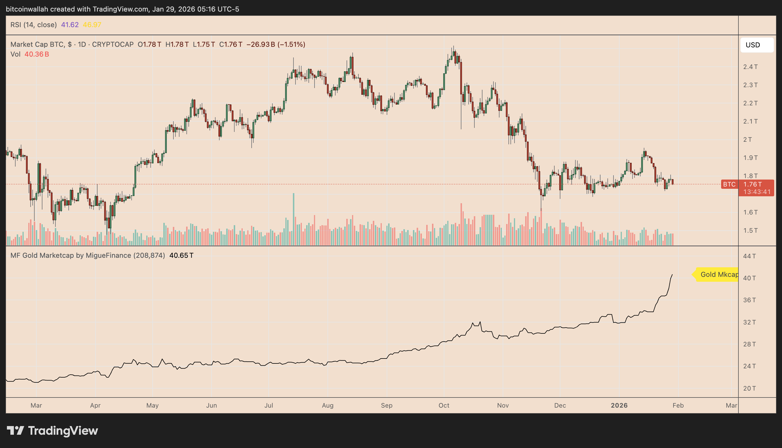 Если инвесторы покупают золото ради защиты от валютных рисков, геополитической неопределенности или сохранения покупательной способности на длинном горизонте, биткоин тоже может получить хотя бы небольшую долю подобных вложений.
