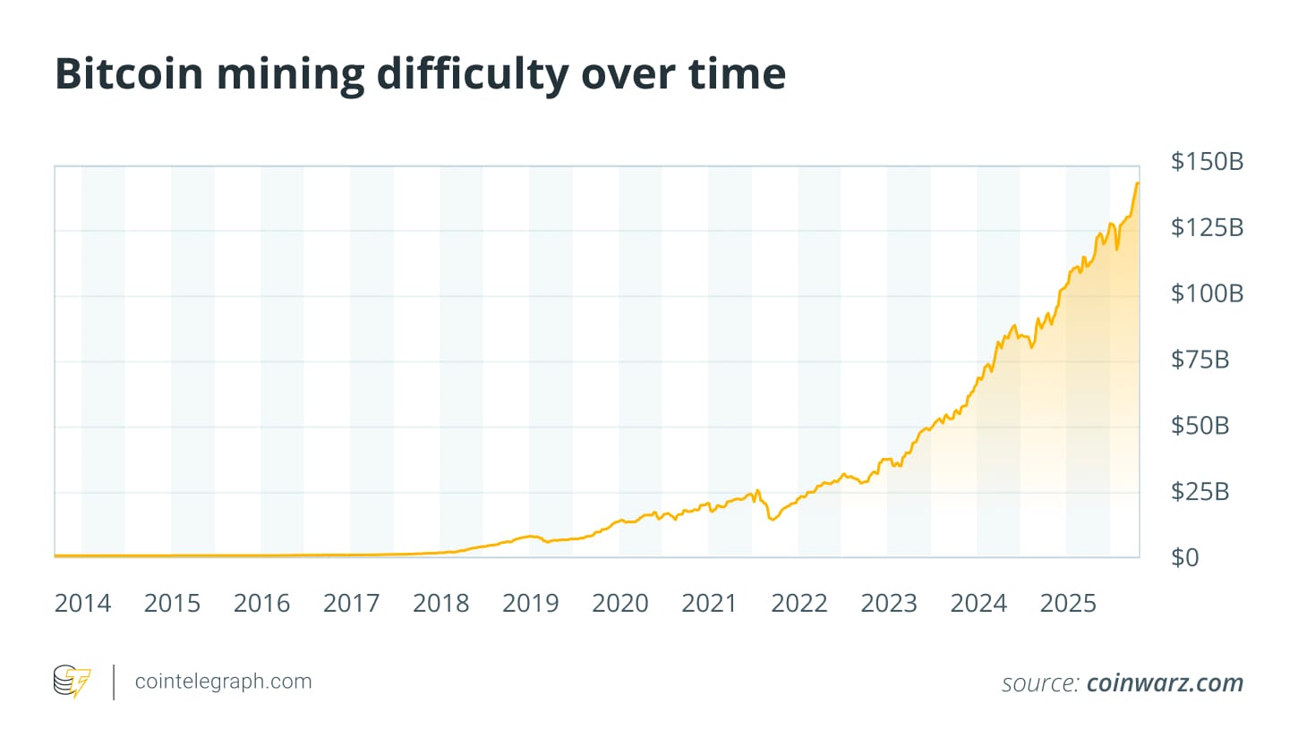 В 2025 году как хешрейт, так и сложность достигли рекордных уровней. Новые, более эффективные комплекты ASIC продолжают появляться, подталкивая сложность вверх и вытесняя старые установки с рынка.