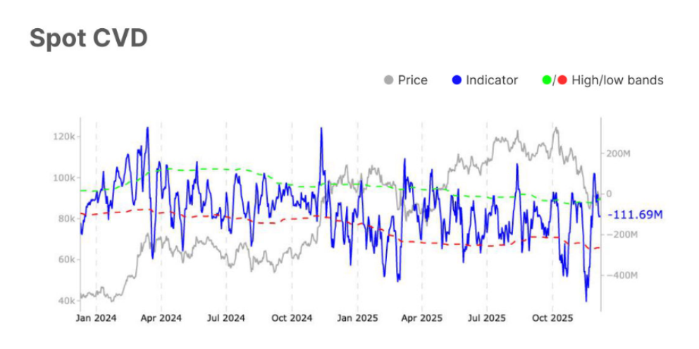 Кумулятивный объём Delta (CVD) спота биткойна, индикатор, измеряющий чистую разницу между объёмами покупок и продаж на биржах, показывает, что чистая спотовая покупка остается отрицательной даже после недавнего отскока биткойна.