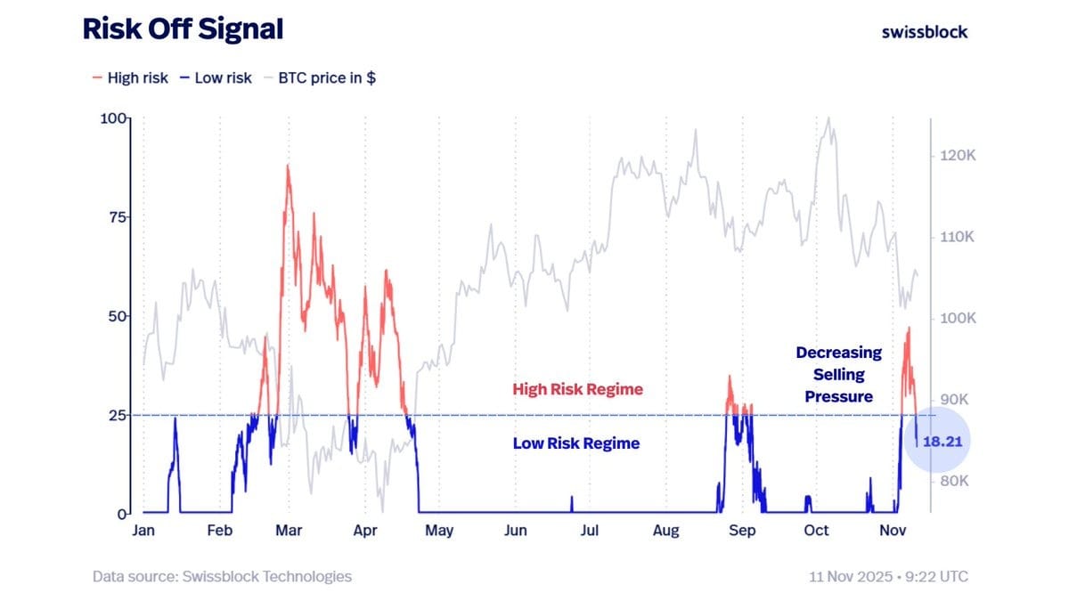 “Сигнал об уменьшении риска снова перешел в режим низкого риска, показывая, что давление продаж ослабевает по мере восстановления биткоина,” заявил личный управляющий активами Swissblock в своем последнем анализе BTC, добавив: