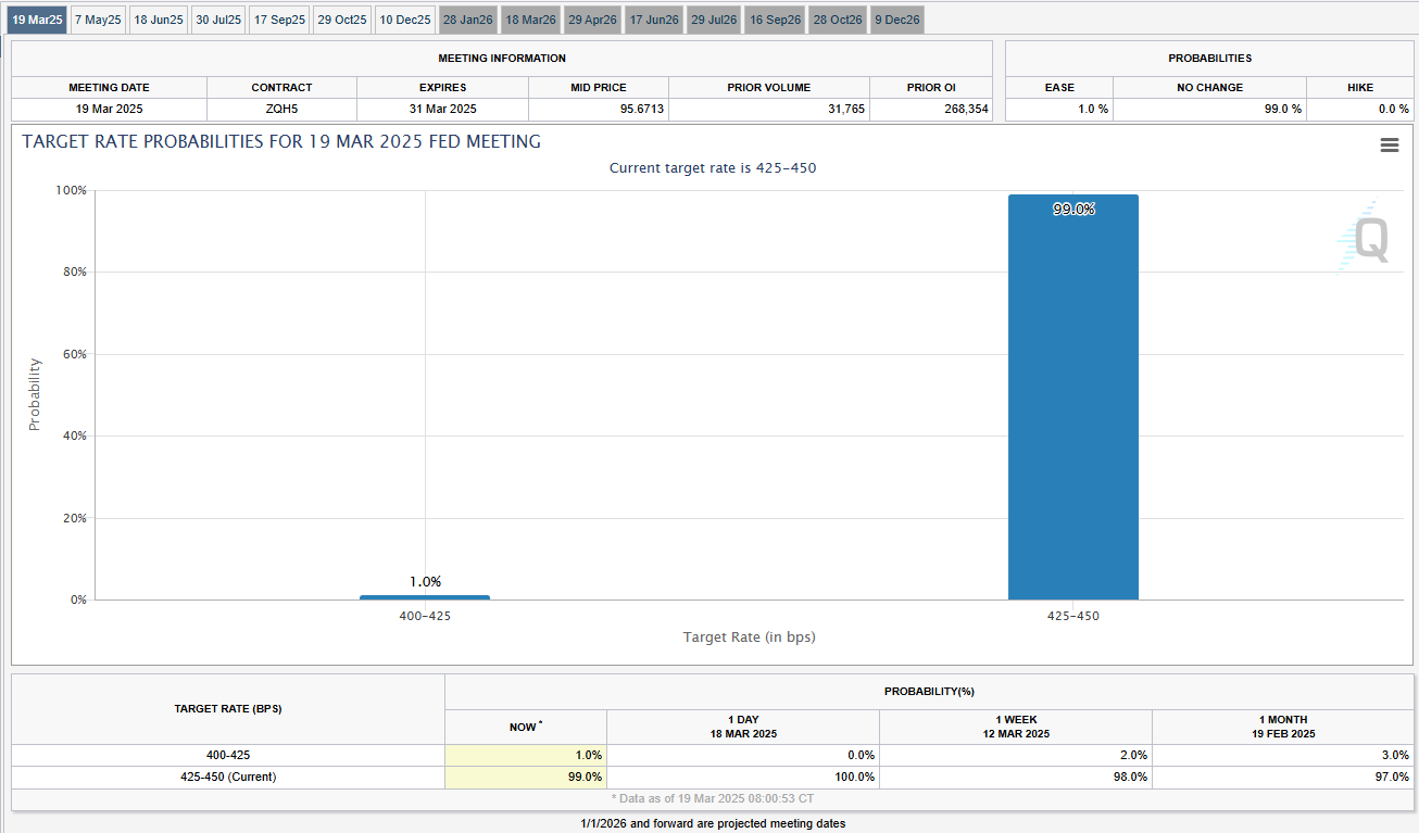 Рынки на данный момент оценивают вероятность в 99% того, что ФРС оставит процентные ставки неизменными, согласно последним оценкам инструмента FedWatch группы CME.