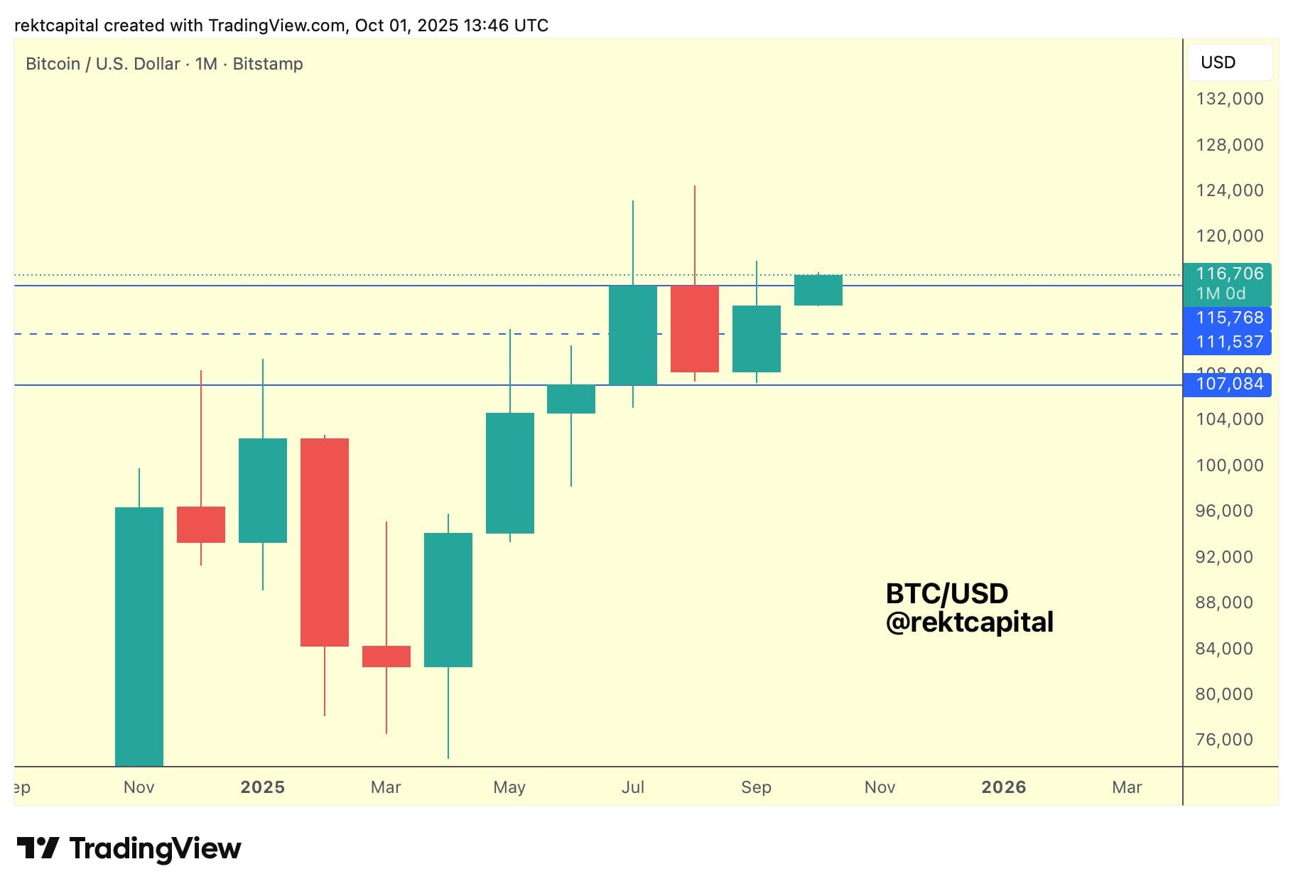 “Биткоин уже пытается пробить свой месячный диапазон в первый день нового месяца октября,” — популярный трейдер и аналитик Рект Капитал подвел итоги в своем последнем комментарии.