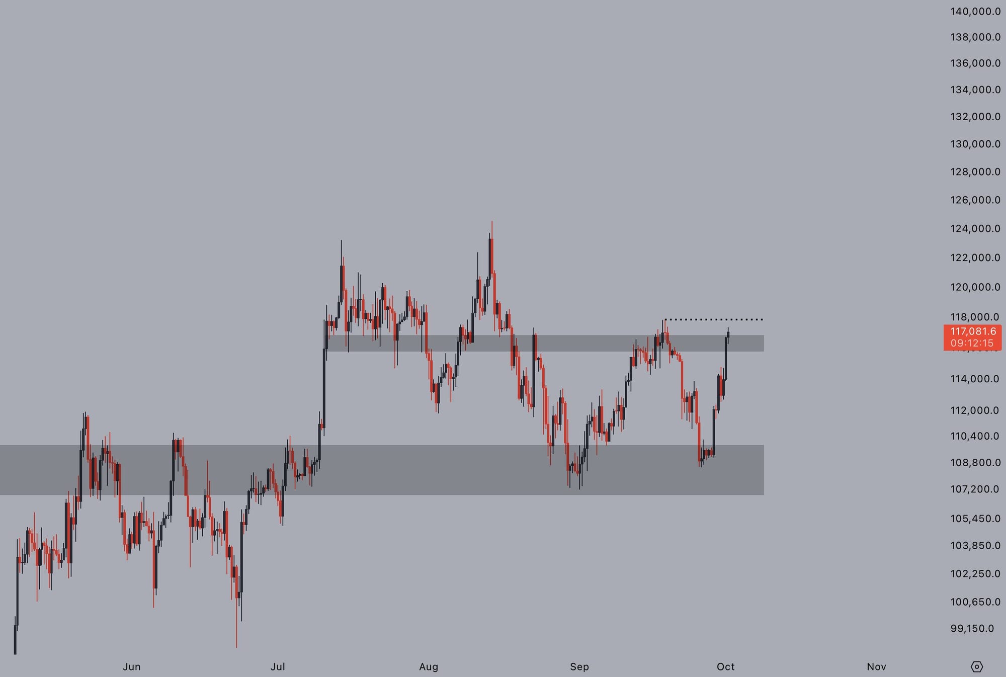 Данные показали, что BTC/USD достиг $117,713 после слабых данных по занятости в США.