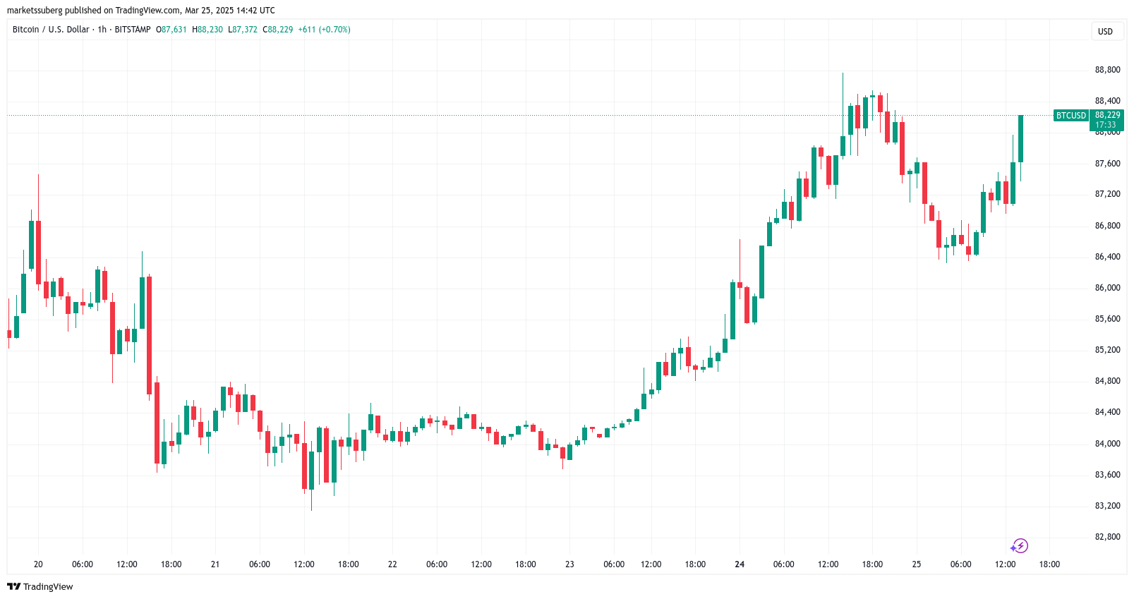 Биткоин (BTC) превысил отметку в $88,000 после открытия торгов 25 марта на Уолл-стрит, поскольку инвесторы оставались крайне чувствительны к торговым тарифам США.