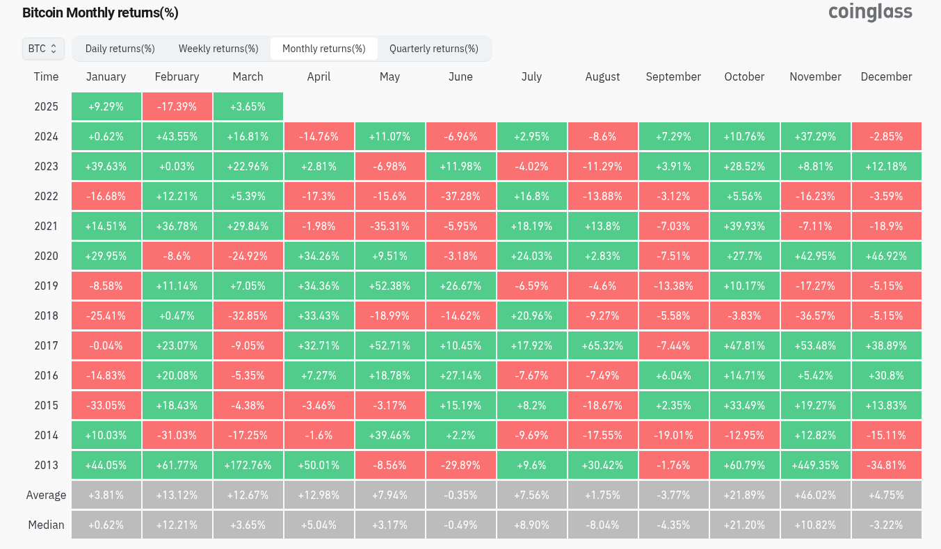 Статистика ресурса CoinGlass показывает, что средняя доходность пары BTC/USD в марте и апреле за последние 11 лет составляла чуть менее 13%.