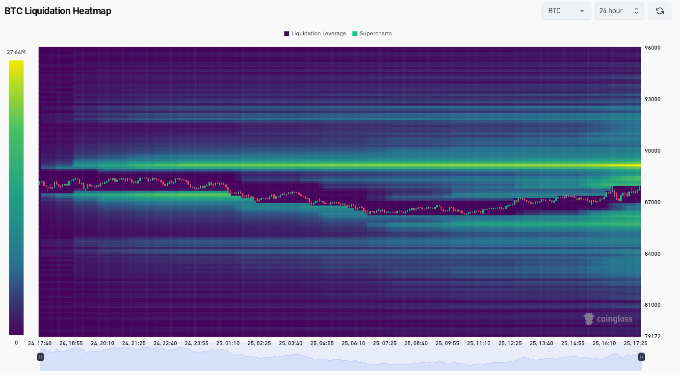 Тем временем CoinGlass показывает продолжающуюся ликвидность продаж чуть ниже $90,000 — ранее приписываемую манипуляциям на рынке трейдером с высоким объемом, известным как «Спуфи Кит».