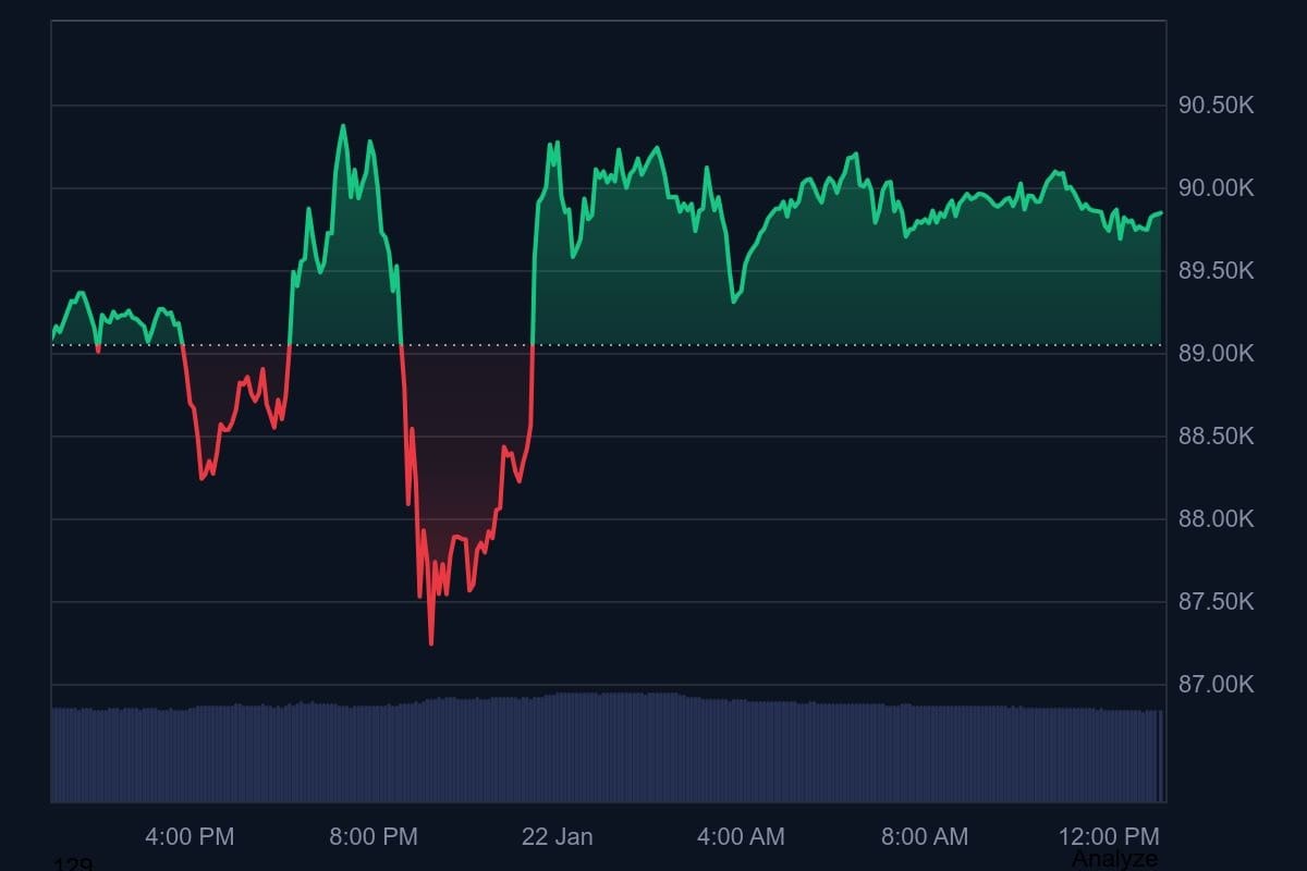 После Давоса он заявил, что у сторон якобы появился «каркас будущей сделки». На этом фоне биткоин (BTC) отреагировал ростом: к закрытию дня цена поднялась примерно с $87 000 до $90 000.