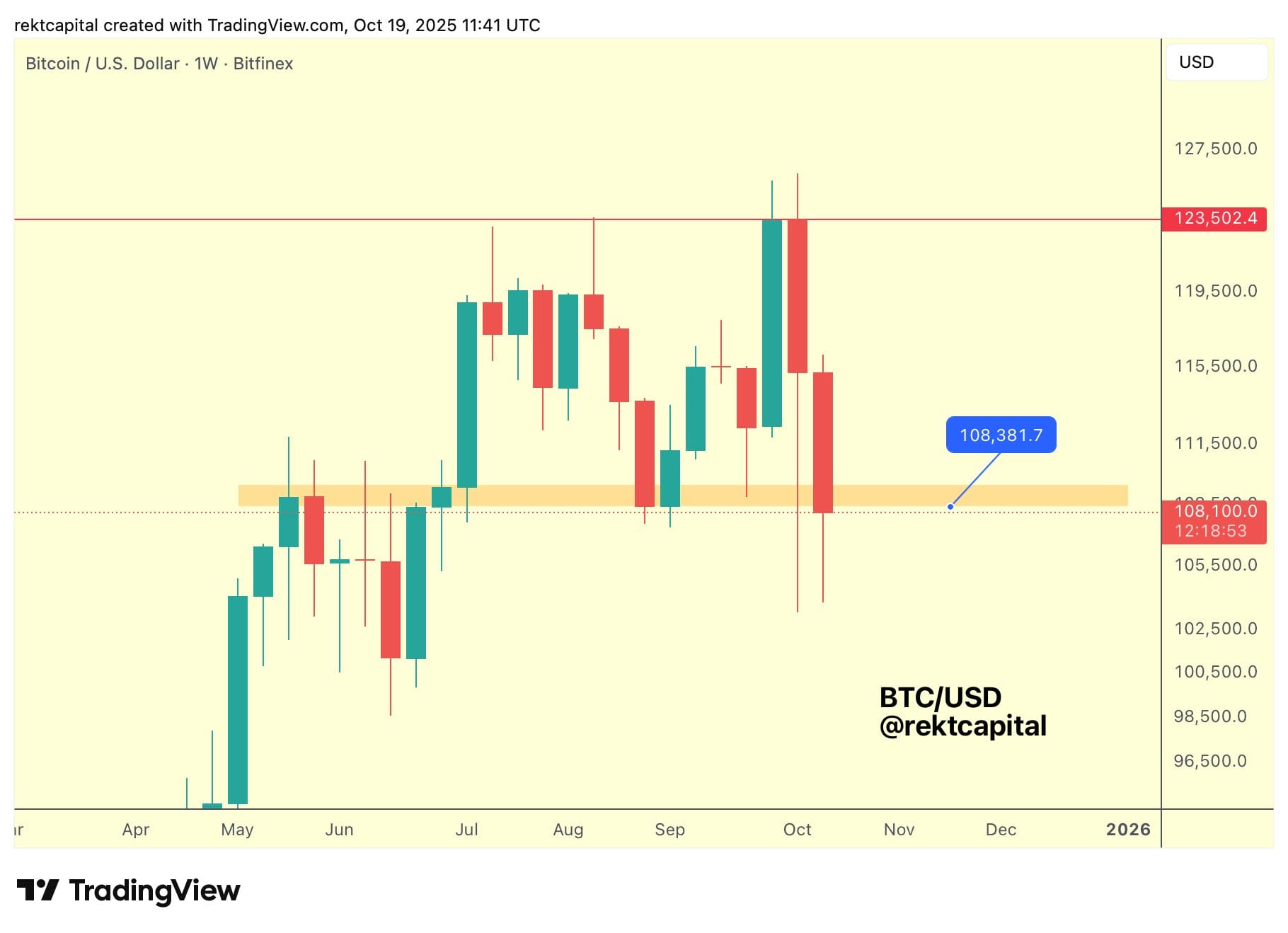 “Биткойну осталось недалеко до обеспечения положительного недельного закрытия выше $108381, чтобы сохранить историческую недельную зону спроса (оранжевую), несмотря на фитили вниз ниже неё,” сказал трейдер и аналитик Rekt Capital, опубликовав недельный график.