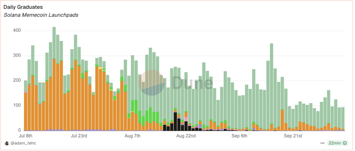 Количество новых мемкоинов, выпускаемых на Solana-based launchpads, резко снизилось с июля, согласно данным Dune Analytics.