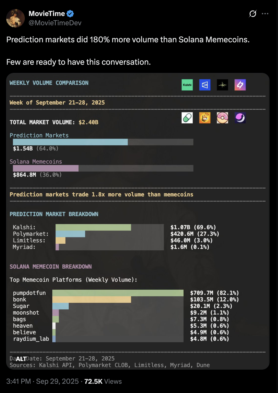 Показано, что мемкоины на Solana обработали объем в $864.8 миллиона за неделю с 21 по 28 сентября, по сравнению с $1.54 миллиарда на предсказательных платформах таких как Polymarket и Kalshi.