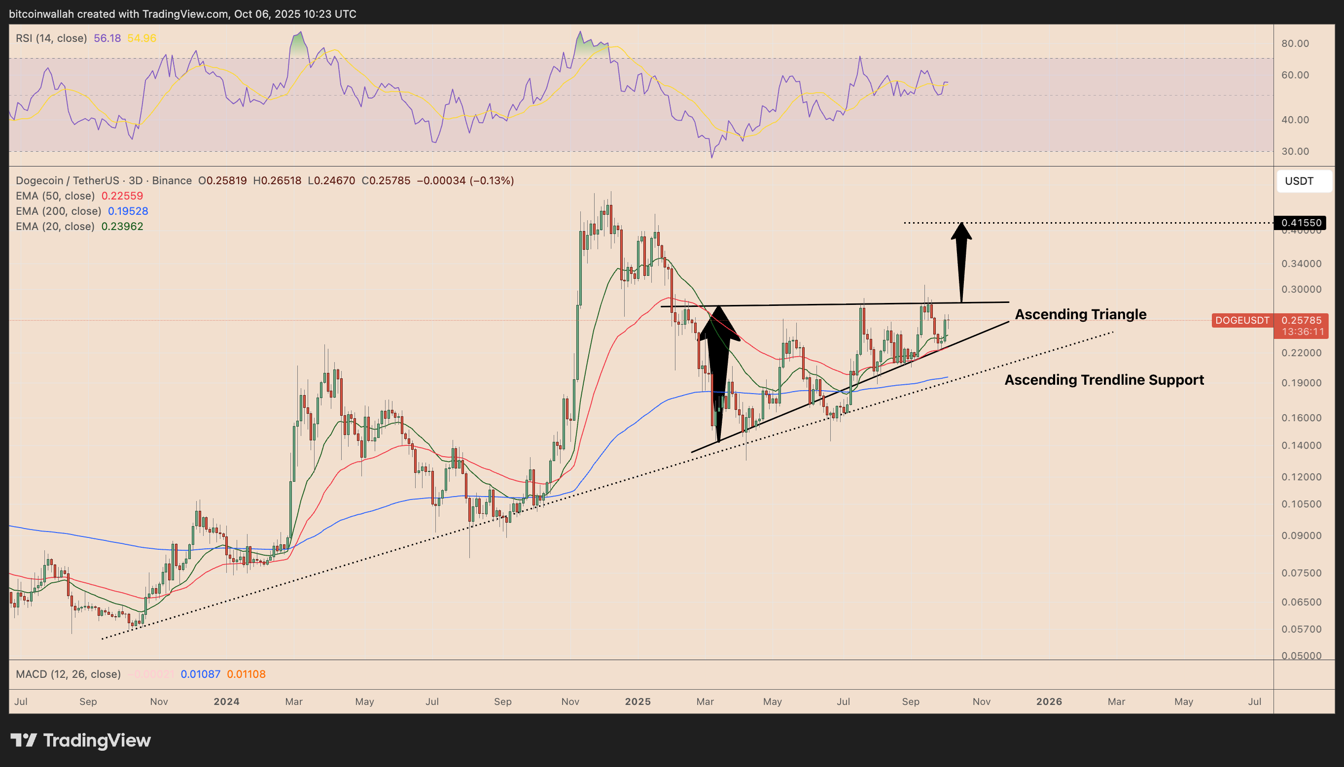 Пробой выше верхней линии треугольника в районе $0.28 может подтвердить установку на бычье продолжение, возможно, достигнув $0.41, что на 60% выше текущих уровней, к концу года.