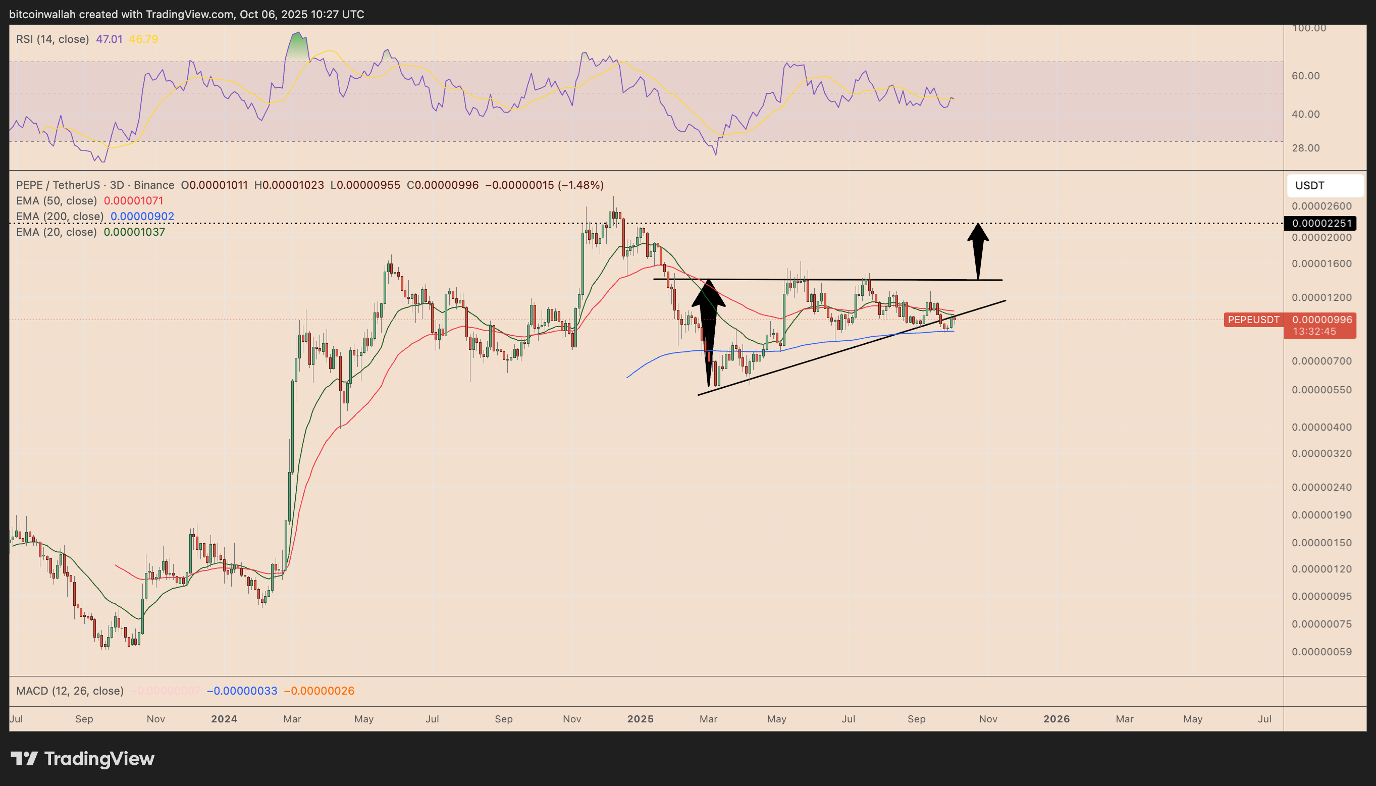 Еще один мемкоин с высоким объемом торгов, Pepe (PEPE), формирует похожую бычью структуру разворота, с целью на конец года на уровне $0.00002230, что представляет собой увеличение на 126% от текущих ценовых уровней.