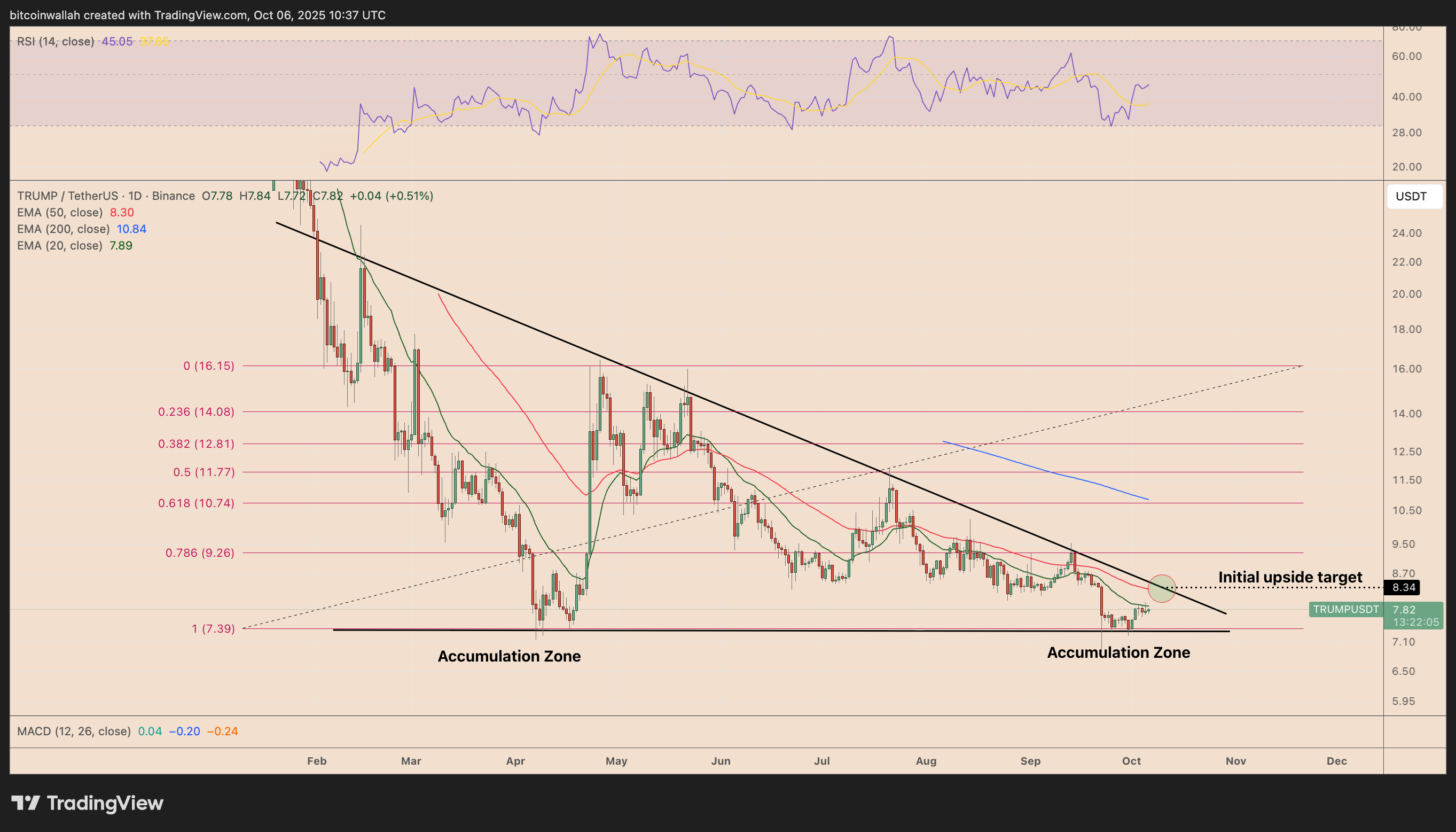 Между тем, цена TRUMP в настоящее время тестирует сопротивление от своей многомесячной нисходящей линии тренда в районе $8.30–$8.35, совпадая с 20-дневной EMA.