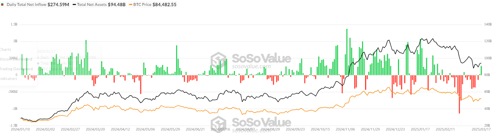Американские биткойн-ETF 17 марта зафиксировали свыше $274 миллионов совокупных чистых притоков, что стало самым высоким днем инвестиций с 4 февраля, когда биткойн торговался выше $98,652, показывают данные Sosovalue.