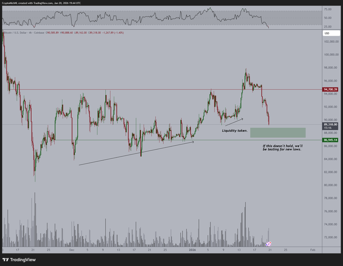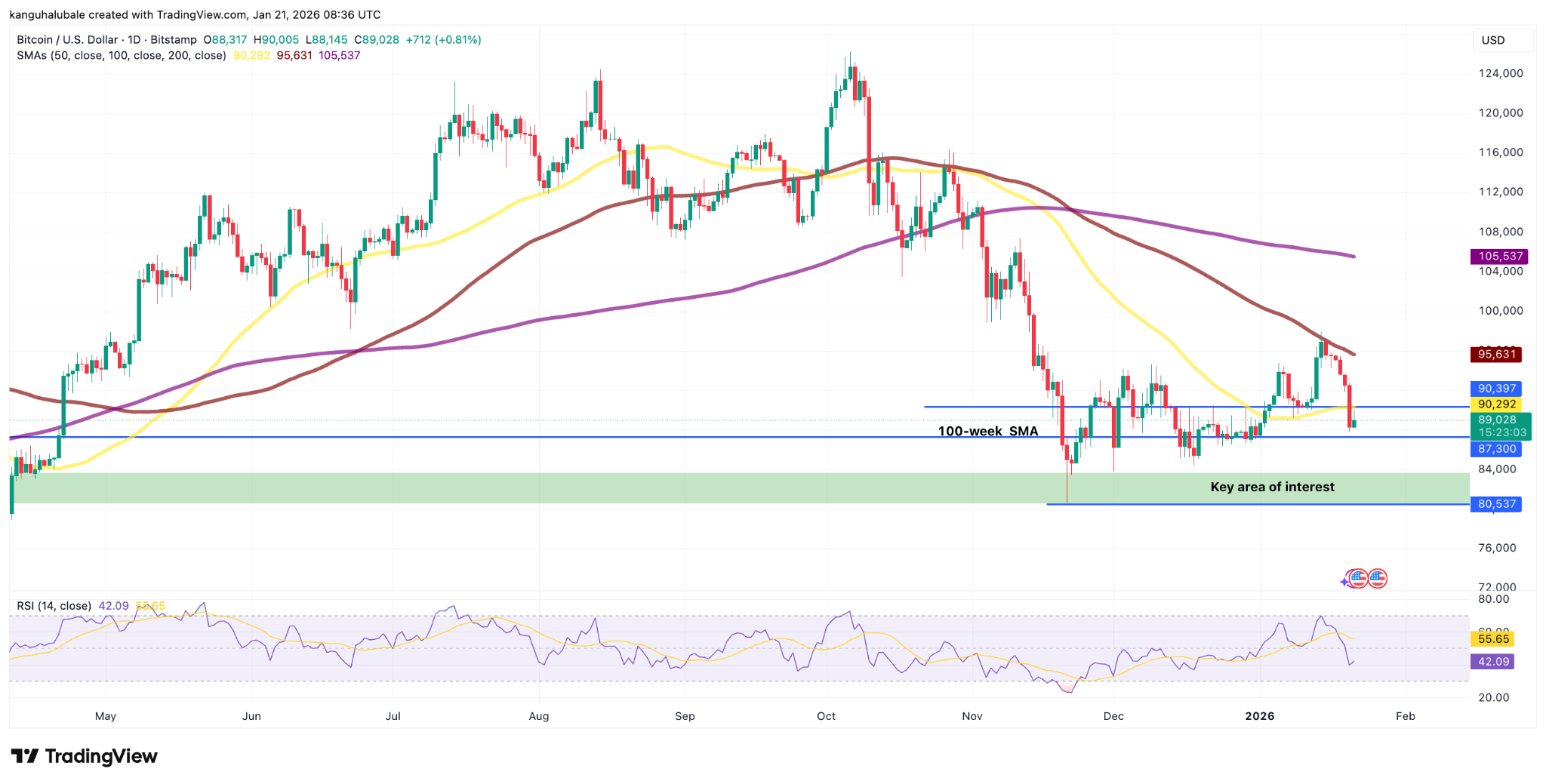 На момент публикации BTC/USD торгуется около $89 000. Следующая линия поддержки находится в районе $87 300 — это также 100-недельная простая скользящая средняя (SMA).
