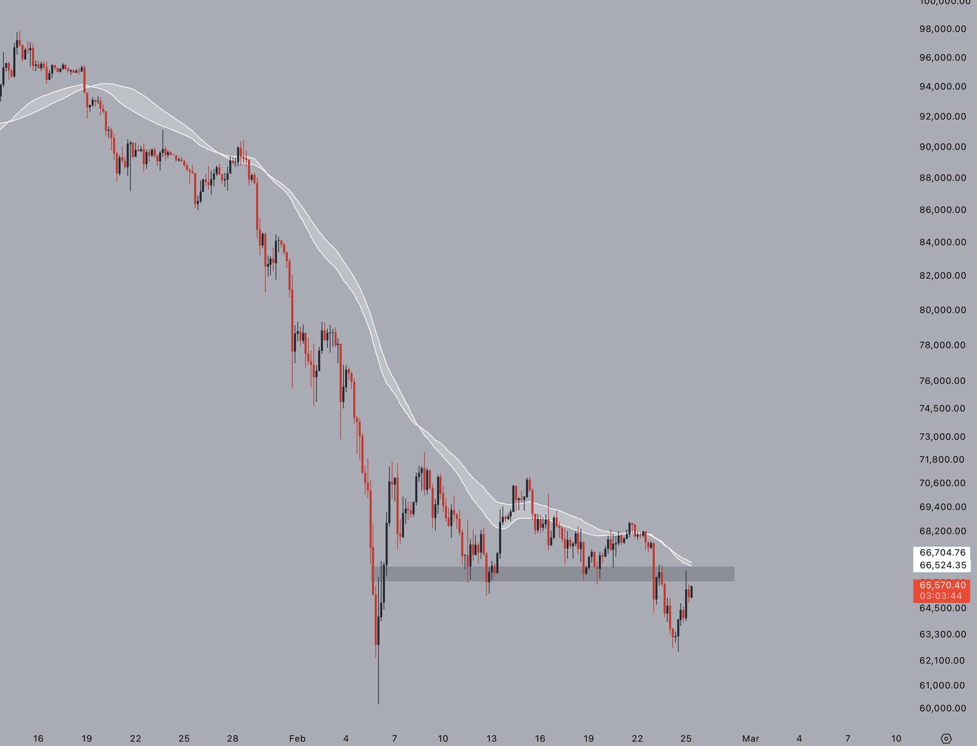 «$BTC упирается в сильное сопротивление на $66k — и из-за локальных минимумов диапазона, и из-за тренда на 4-часовом таймфрейме», — написал трейдер Jelle в разборе в X.