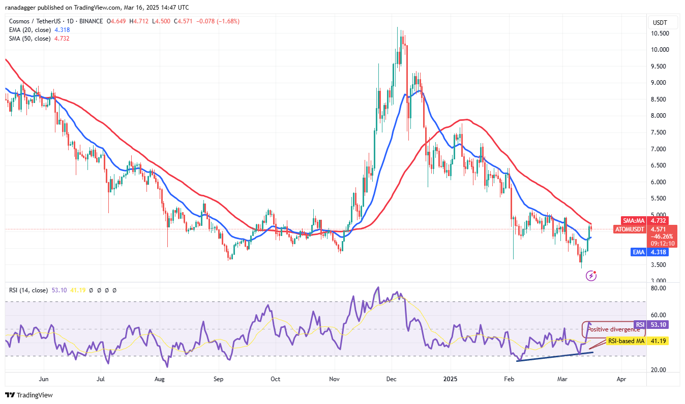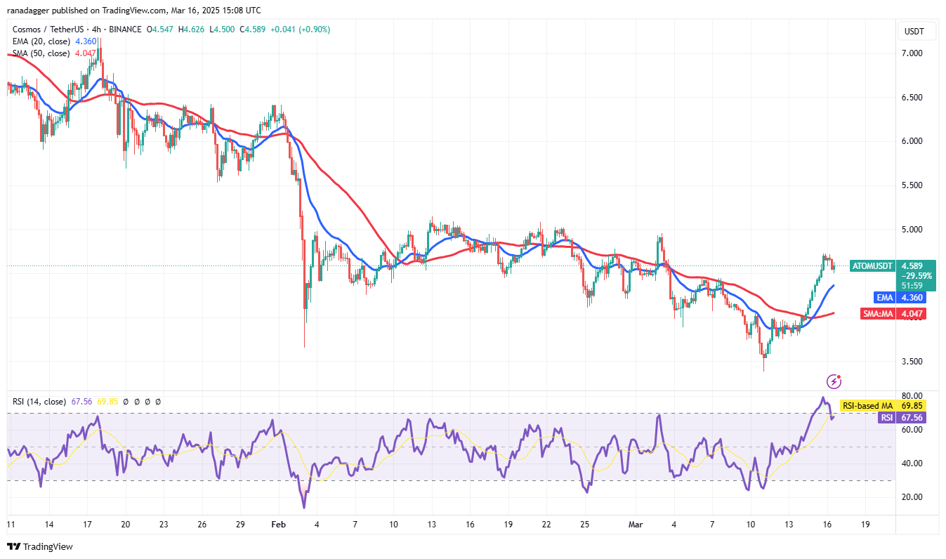 Cosmos (ATOM) пробил 20-дневную EMA ($4.31) 15 марта, что указывает на снижение давления продаж.