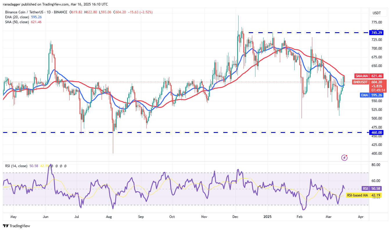 20-дневная EMA ($595) — это критическая краткосрочная поддержка, на которую стоит обратить внимание. Если цена отскочит от 20-дневной EMA, это указывает на то, что быки покупают на мелких падениях. Это повышает шансы на прорыв выше 50-дневной SMA. Пара BNB/USDT может затем устремиться к $686.