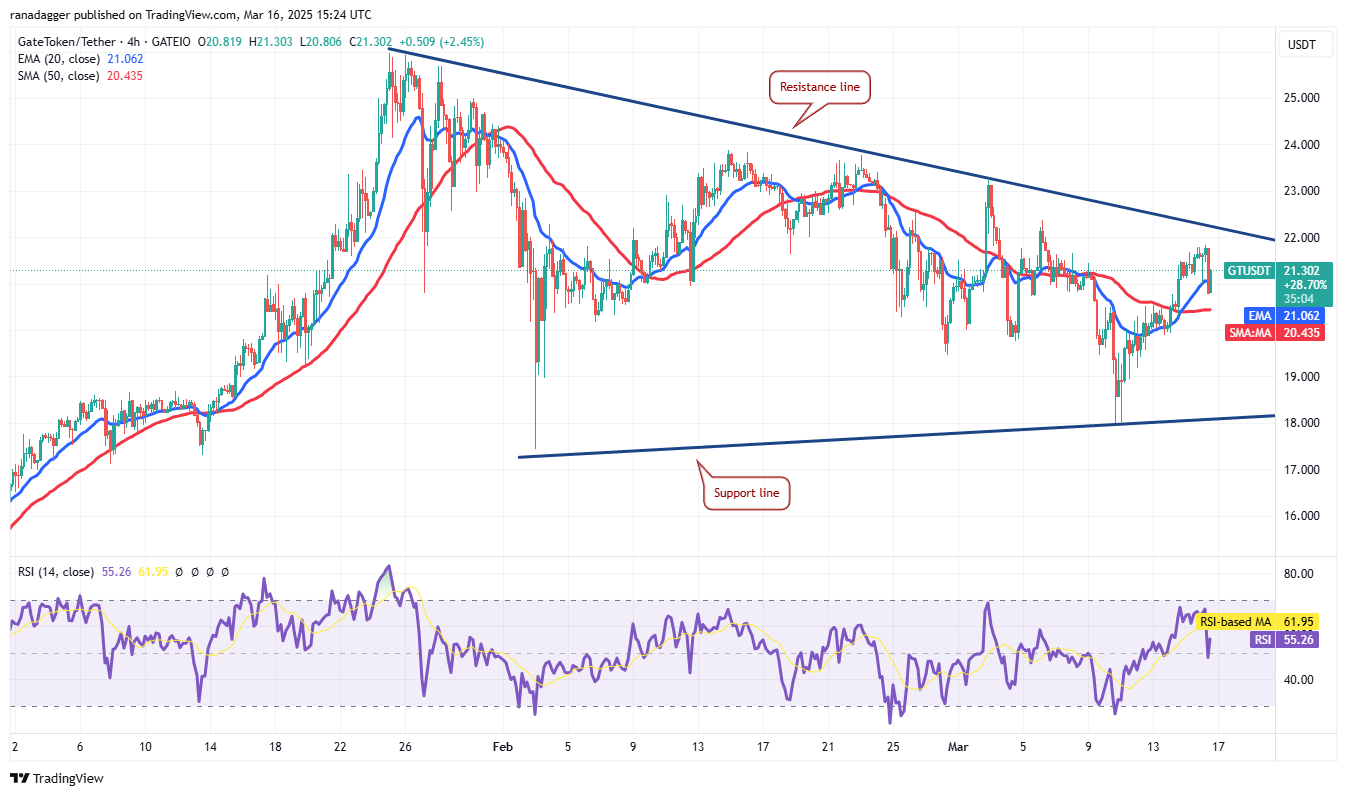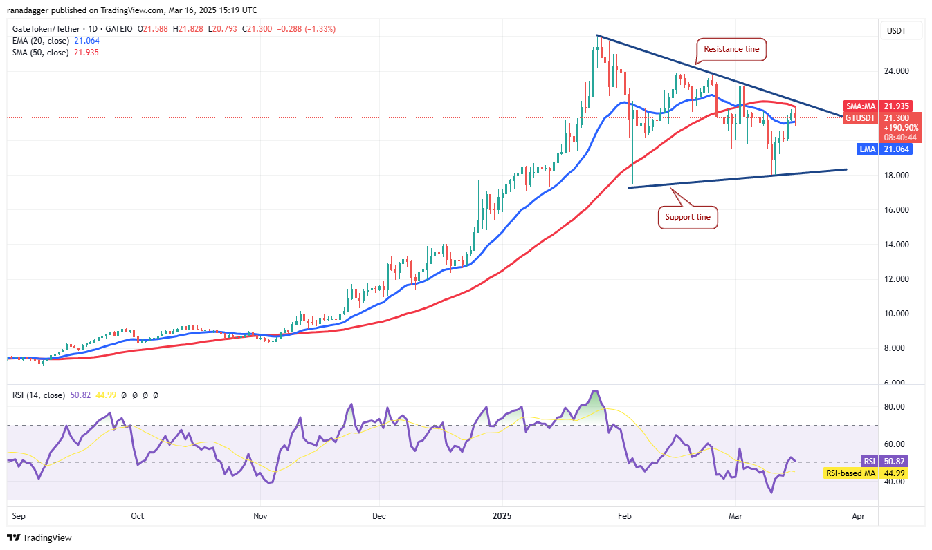 20-дневная EMA ($21.06) выравнивается, и RSI поднялся до середины, указывая на снижение давления продаж. Если покупатели поднимут цену выше треугольника, это сигнализирует о возобновлении движения вверх. Пара GT/USDT может подняться до $24 и затем до $26.