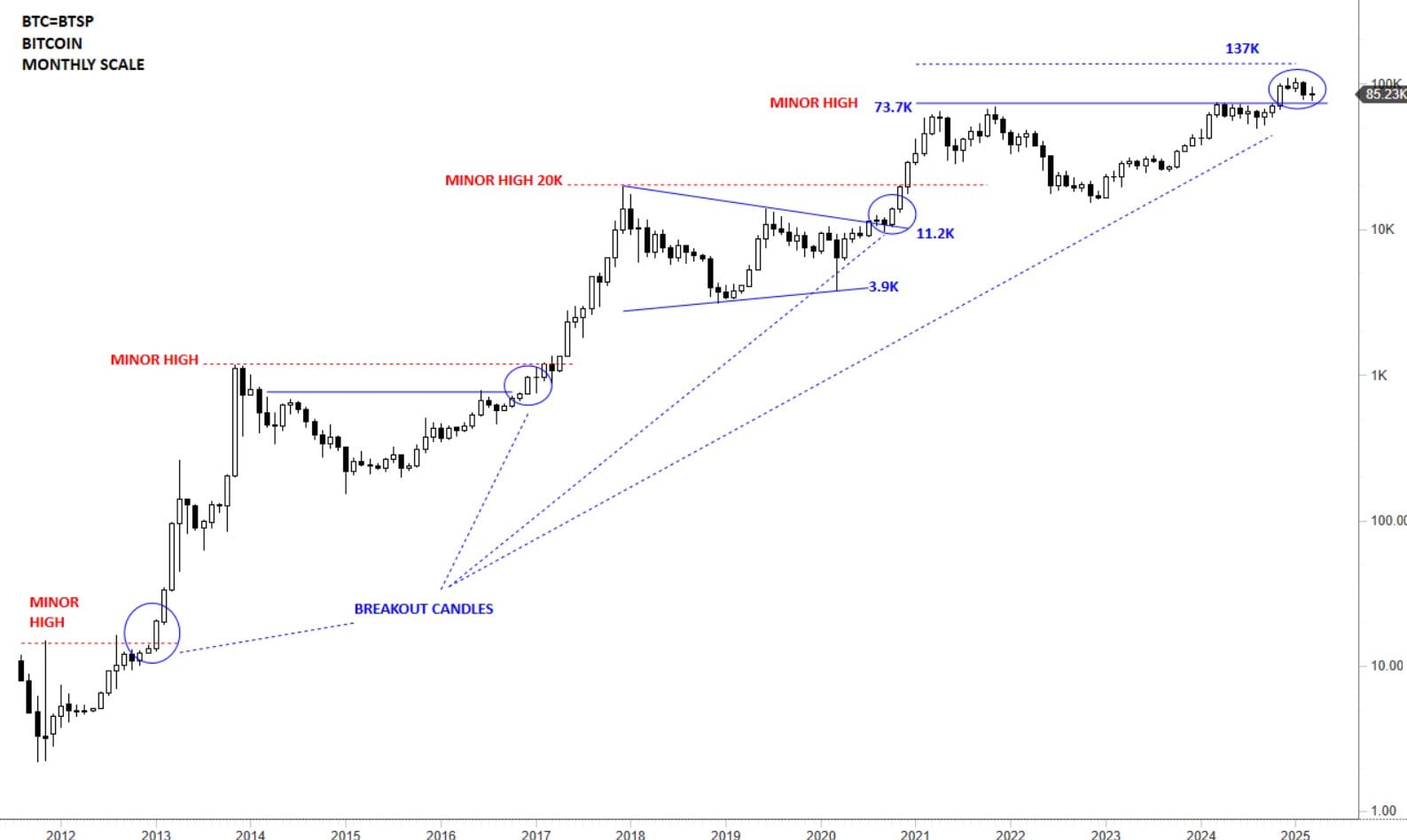 «Долгосрочный график по BTC/USD. Все еще выглядит как отскок к пробитому уровню $73,7K. То, что последует после, определит динамику цены на следующие несколько месяцев.»