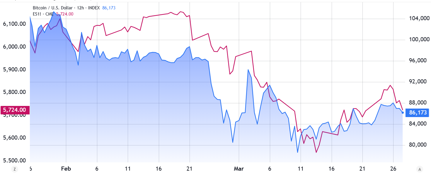 Фьючерсы S&P 500 (слева) vs. Bitcoin/USD (справа). Источник: TradingView