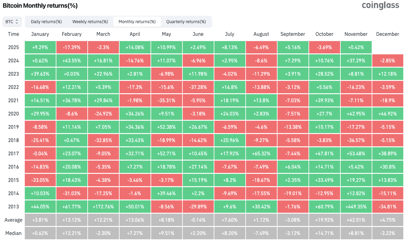 Как сообщает dc.finance, ноябрь традиционно является самым прибыльным месяцем для биткойна, причем данные CoinGlass подтверждают средний рост на 42.5% с 2013 года.