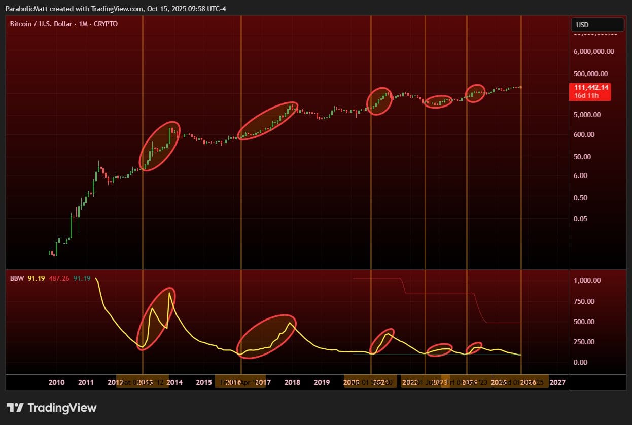 «Ежемесячные полосы Боллинджера достигли самых экстремальных уровней в истории биткойна», написал он в X.