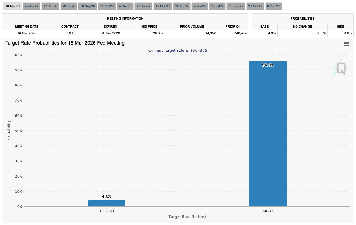 Эти цифры еще сильнее уменьшили вероятность снижения ставки ФРС на мартовском заседании: по оценке FedWatch вероятность шага на 0,25 п. п. составляет около 4%.