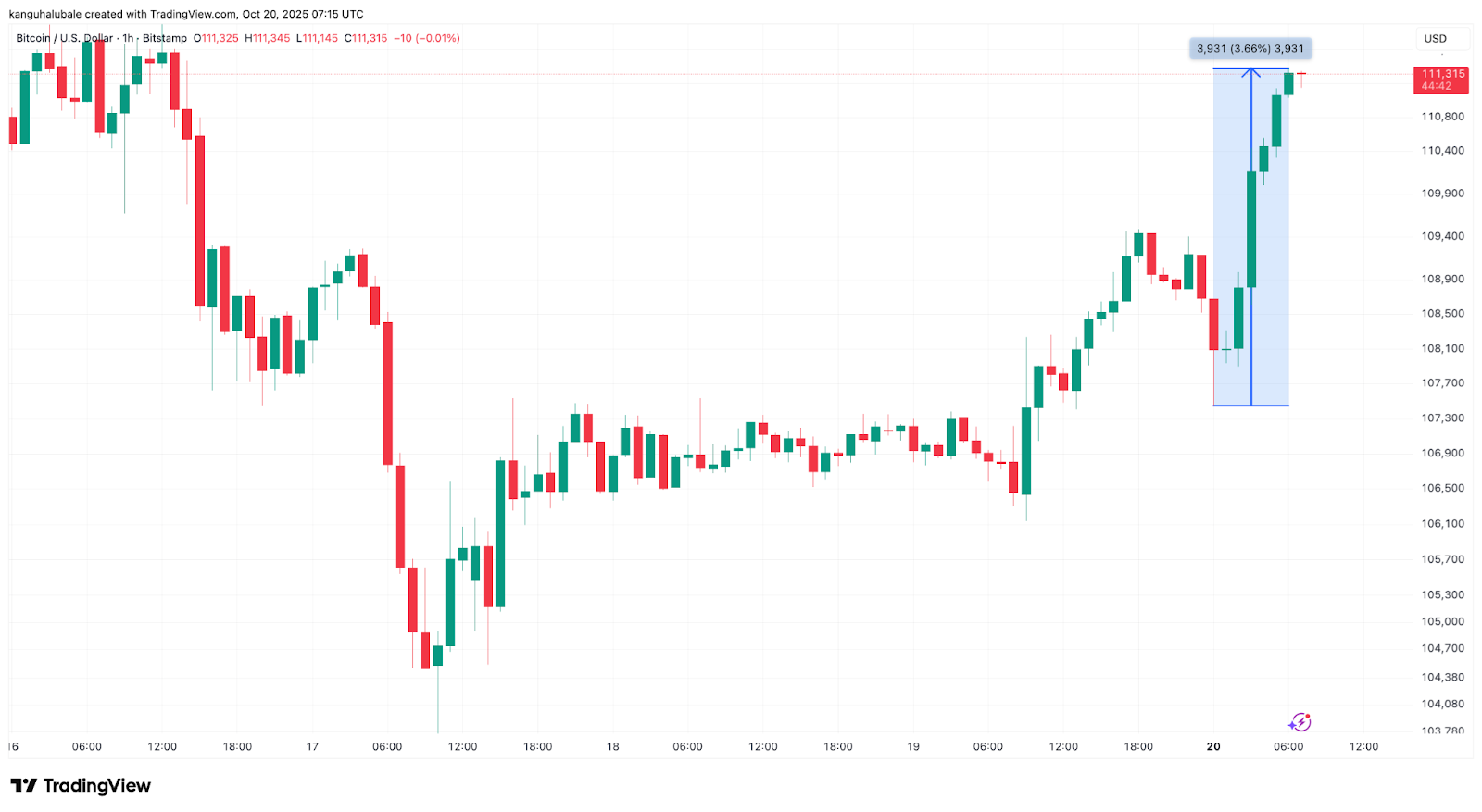 Цена биткойна достигла $111,430, увеличившись на 4% за последние 24 часа и на 7,6% выше пятничного минимума в $103,530, согласно данным dc.finance Markets Pro и TradingView.